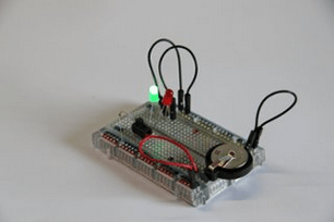 This challenge uses a prototyping board (also called a breadboard) to make a circuit that turns on either a red or green L.E.D.