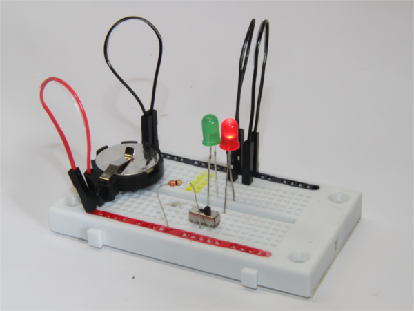Overview: This challenge uses a prototyping board (also called a breadboard) to make a circuit that turns on either a red or green L.E.D.